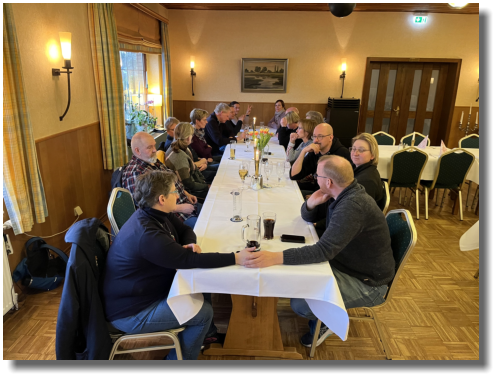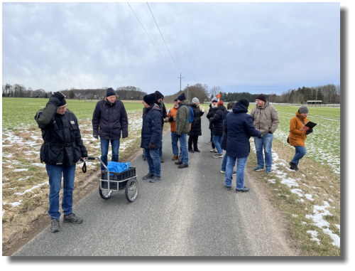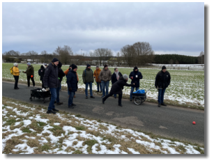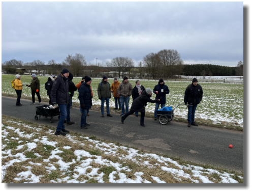 Boßel-Tour Am 21.01.2024 fand die VSC Boßel-Tour statt. Los ging es am alten Postweg Richtung Limmerberg. Am alten Postmeilenstein in Kettenburg ging es dann weiter über Feldwege nach Wehnsen. Getränke gab es reichlich, der Klassiker war mal wieder Glühwein mit einem Schuss Rum, da dass Wetter bitter kalt war. Bis nach Wehnsen wurde mit zwei Mannschaften erbittert geboßelt. Am Ende haben beide Mannschaften gleich viele Würfe gebraucht. Von Wehnsen ging es über die Ulmenallee nach Jeddingen in die Jeddinger Dorfstraße. Ziel war der Jeddinger Hof. Nach und nach traf die Gruppe im Jeddinger Hof ein. Aufgrund verschiedener Faktoren wie z.B. Alter und Alkoholpegel entzerrte sich die Gruppe ein wenig. Schlussendlich haben es alle geschafft und gemeinsam wurde Grünkohl mit Pinkel und Kasseler gegessen.