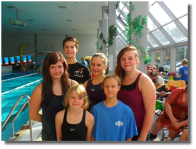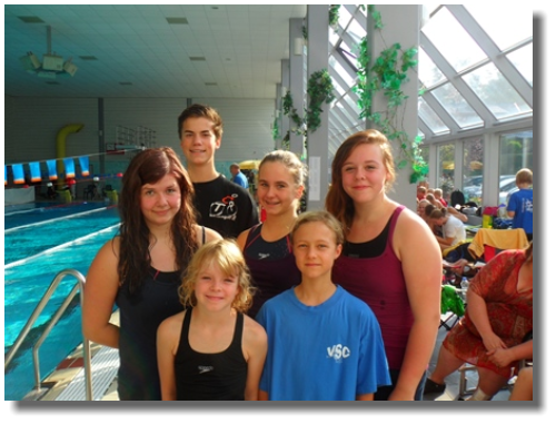 Zum 23. Sprintertag in Hambergen... ...fanden sich am 08/09/2013 12 weiter Vereine neben dem Visselhöveder Schwimmclub ein. Mit Aileen Behrens, Inga Bostelmann, Sabrina Götz, Danielle Krüger, Jana Schwarze und Trond Skage reuter war die Mannschaft des VSC´s relativ übersichtlich und klein. Aileen tratt fünfmal an den Start und überzeugte mit solider Leistung, 50m Brust (0:49,19) und Rücken (0:46,89) platzierte sie auf dem Zweiten, die 50m Freistil (0:38,66) liefen genauso gut wie die 50m Schmetterling. Etwas meer Luft benötigte sie dann für ihren letzten Start ging er doch über 100m Lagen (1:40,69). Inga Bostelmann, Danielle Krüger und Jana Schwarze standen in der Anzahl ihrer Starts nicht hinten an und punkteten ebenfalls auf den Strecken und zeigten allesamt einen hohen Leistungsstand in ihren starkbesetzten Jahrgängen. Sabrina Götz tratt dreimal auf und zeigte, dass sich ihr Trainingsfleiß auszahlte. Sie konnte sich bei ihren 50m Freistil, Brust und Rücken persönlich verbessern. Unser "Hähnchen" im Korb Trond Skage steigerte sichbar und seine persönlichen Bestleistung über die 50m Freistil (0:28,46) und 50m Rücken (0:34,61). Bei den 50m Brust zeigte er konstante Leistung. gez. der wikinger